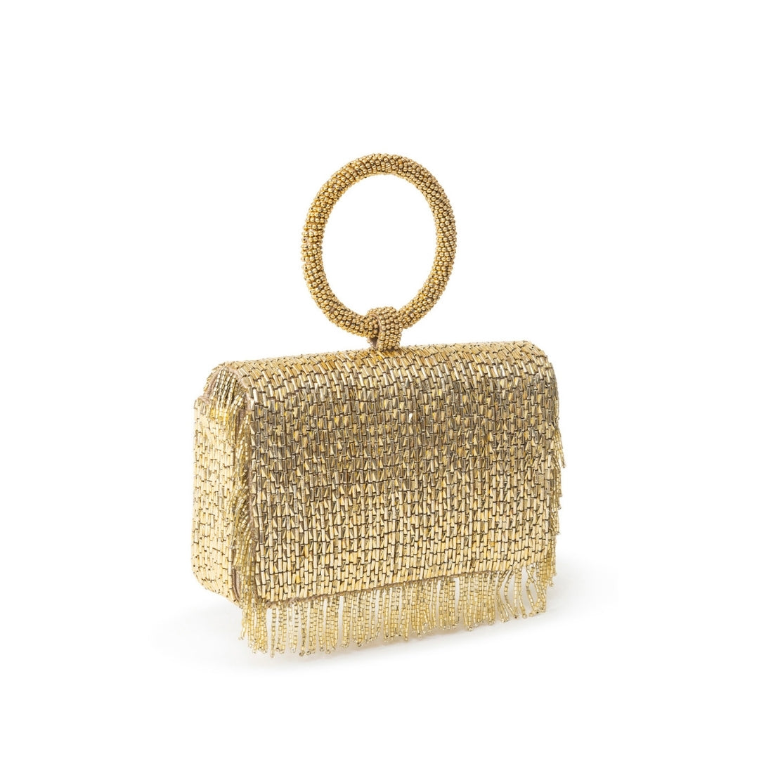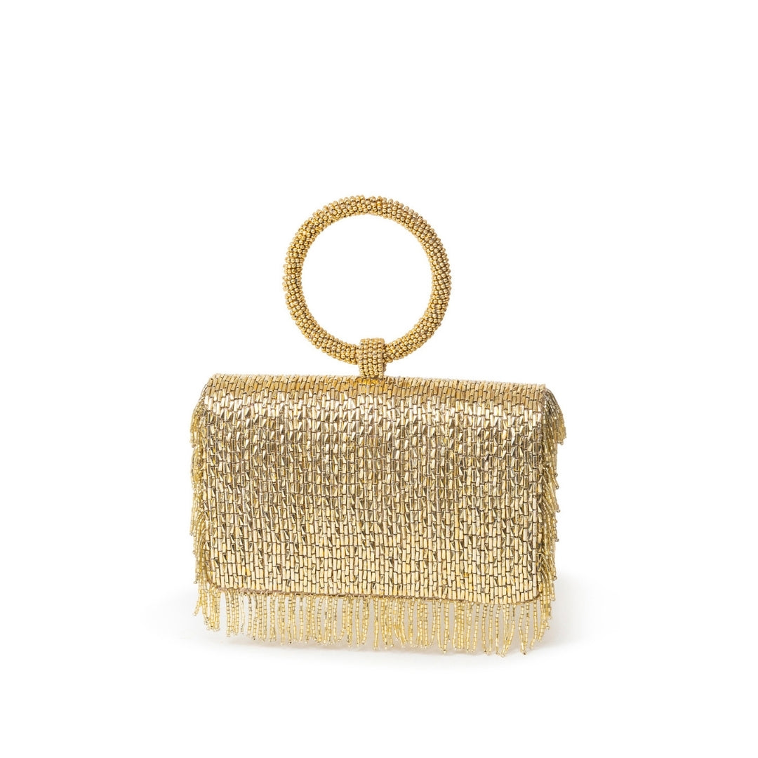 This captivating clutch combines playful crystal fringe detailing with an embellished bangle handle, creating a clutch that,s perfect for adding a touch of free spirited style to your ensemble.